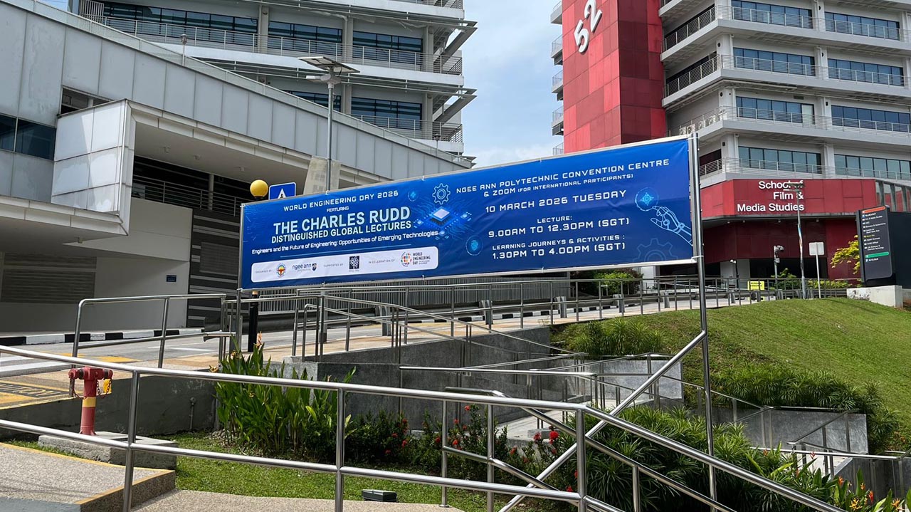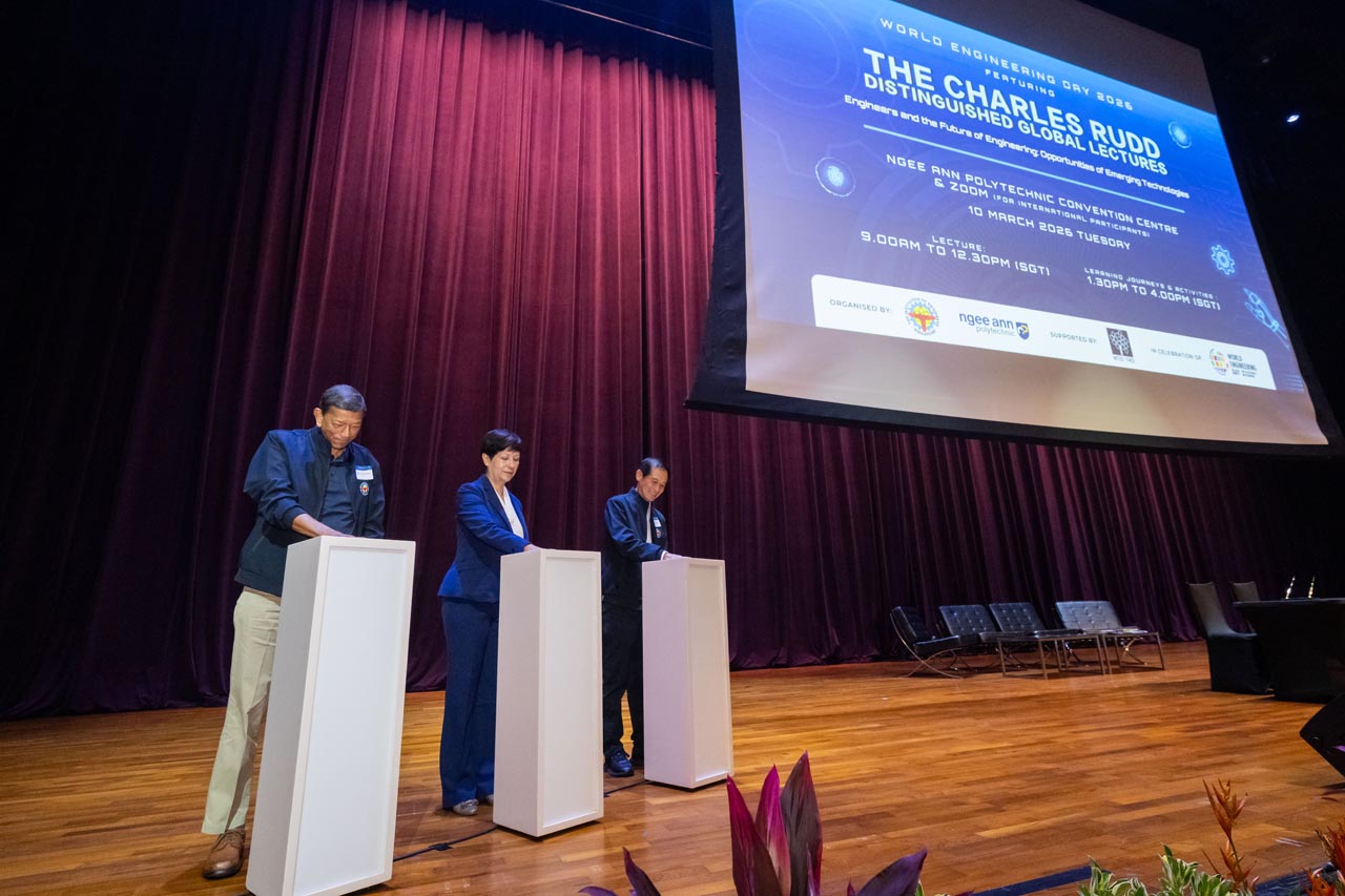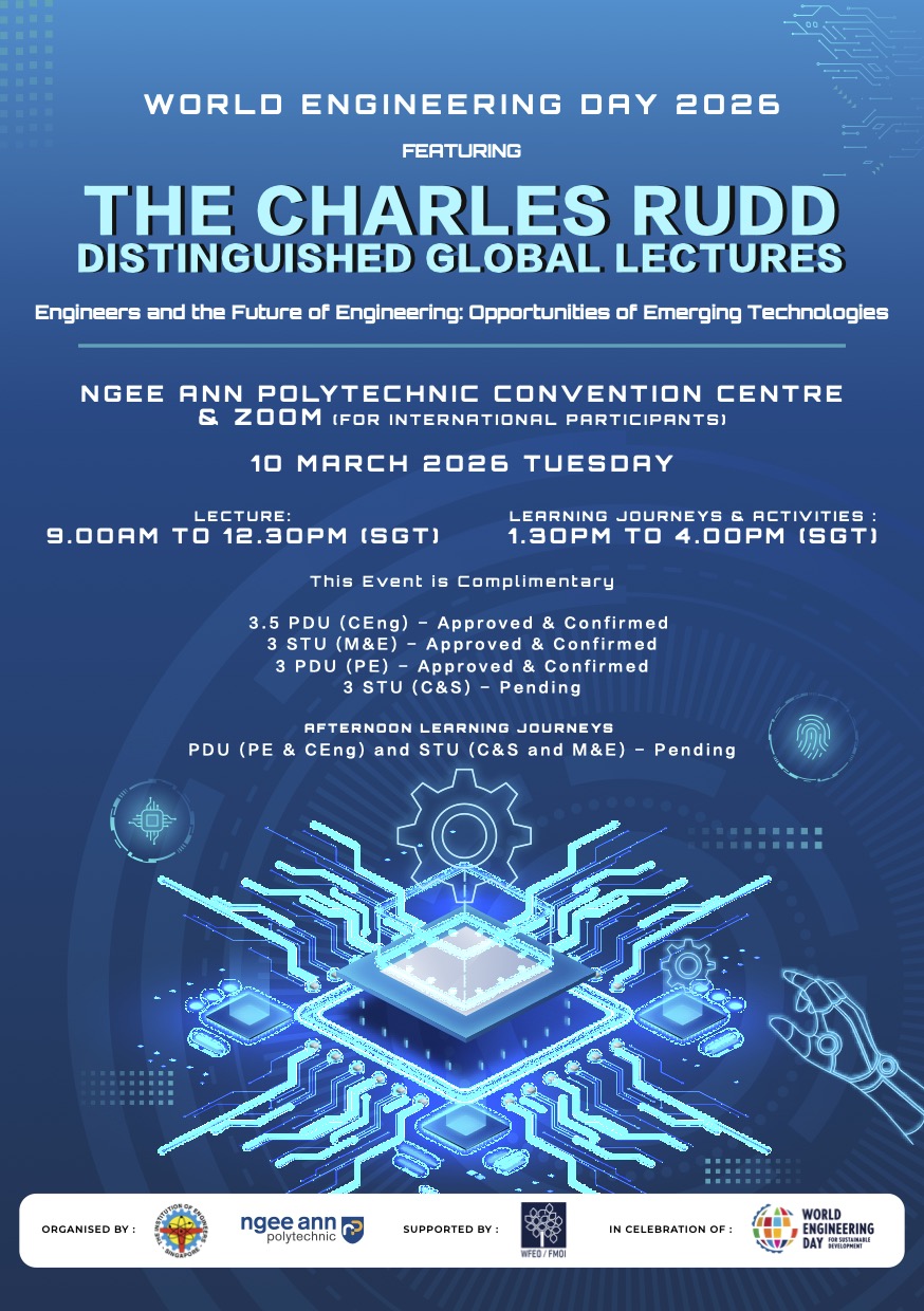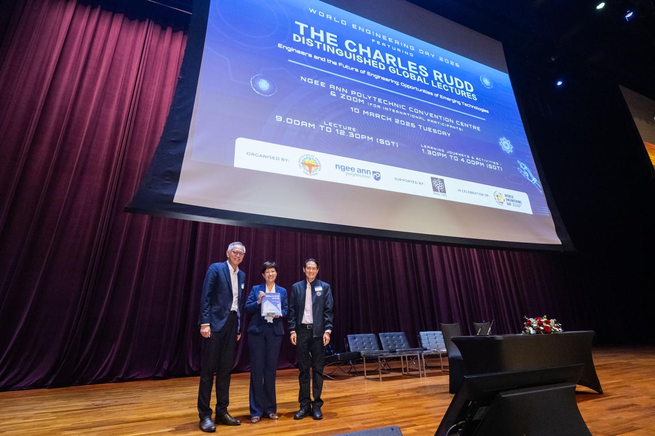 In celebration of UNESCO’s Declaration of the World Engineering Day (WED), the Institute of Engineers Singapore (IES) and Ngee Ann Polytechnic (NP) partnered to organise World Engineering Day 2026: Charles Rudd Distinguished Global Lecture (WED 2026: CRDGL). This annual event aims to promote a greater appreciation of engineering, honouring the late Er. Charles Rudd. WED 2026: CRDGL provides a platform for leading engineers, innovators and thought leaders to exchange insights and ideas within the industry. This event features a three-hour hybrid lecture, drawing hundreds of local and overseas participants, with event highlights being recorded and broadcasted globally to celebrate engineering achievements. Participants had the opportunity to attend keynote speeches and panel discussions with fellow industry professionals to gain practical insights into how engineering could contribute to creating a more prosperous world. Significant proceedings included the launch of the IES 60 logo and an MOU signing between Ngee Ann Polytechnic and Siemens, witnessed by Ms. Indranee Rajah, to drive the SkillsFuture Queen Bee initiative forward.